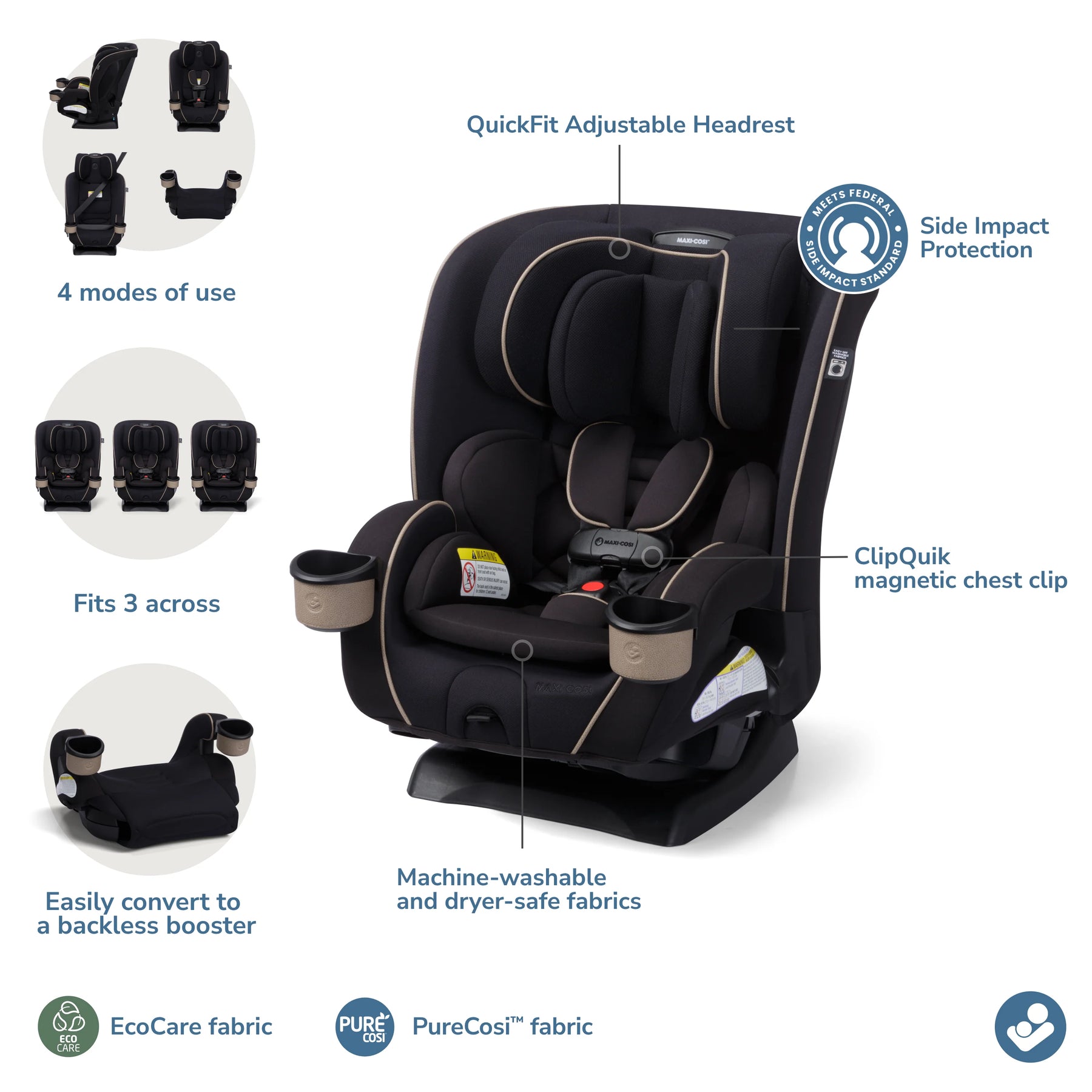 The Maxi-Cosi Kani 4-in-1 Convertible Car Seat is designed to be your child’s car seat from the first ride home from the hospital through the big kid booster stage. This all in one car seat has 4 modes: rear-facing car seat (5–40 lbs., 19"–40"), forward-facing car seat (30–65 lbs., 34.4"–49"), belt-positioning booster seat (40–100 lbs., 43.4"–52"), and backless booster seat (40–100 lbs., 43.4"–57").